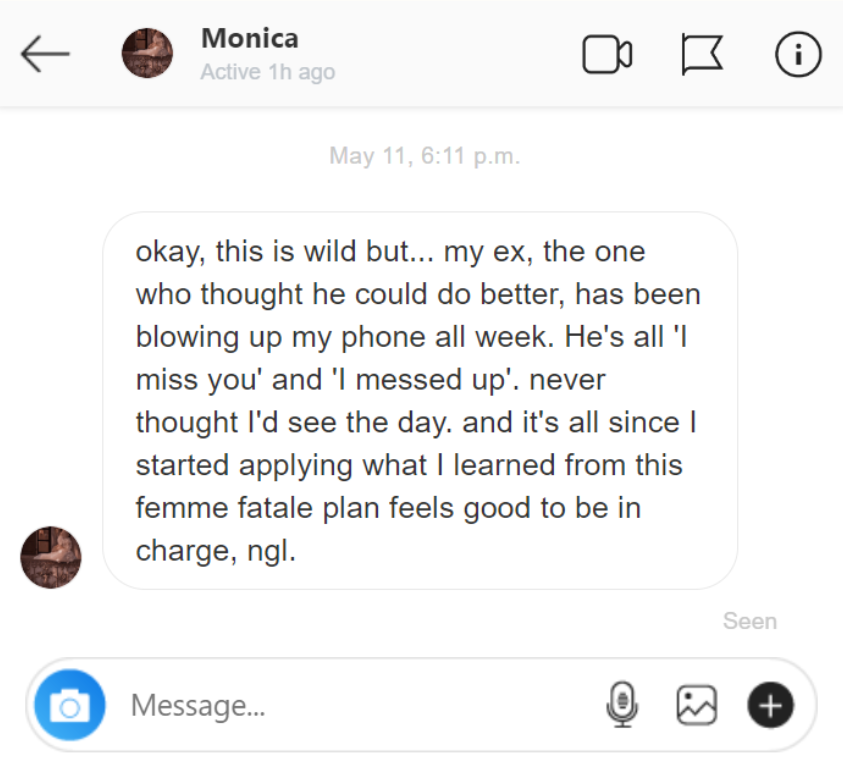 “ He's all 'I miss you' and 'I messed up'. never thought I'd see the day. and it's all since I started applying what I learned from this femme fatale plan..."