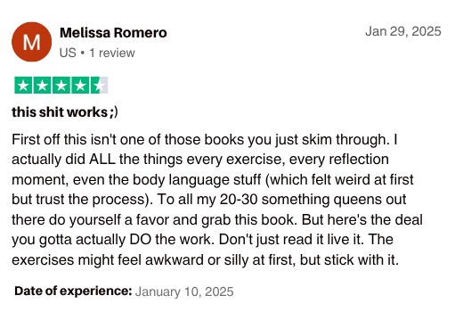 “If you're into self improvement and want something that goes beyond the usual girl boss stuff, this hits different. It's like having a no nonsense friend giving you actual steps to work on yourself, minus all the fluffy Instagram quote vibes. Perfect if you want a guide that gives you real tools instead of just vague advice.”