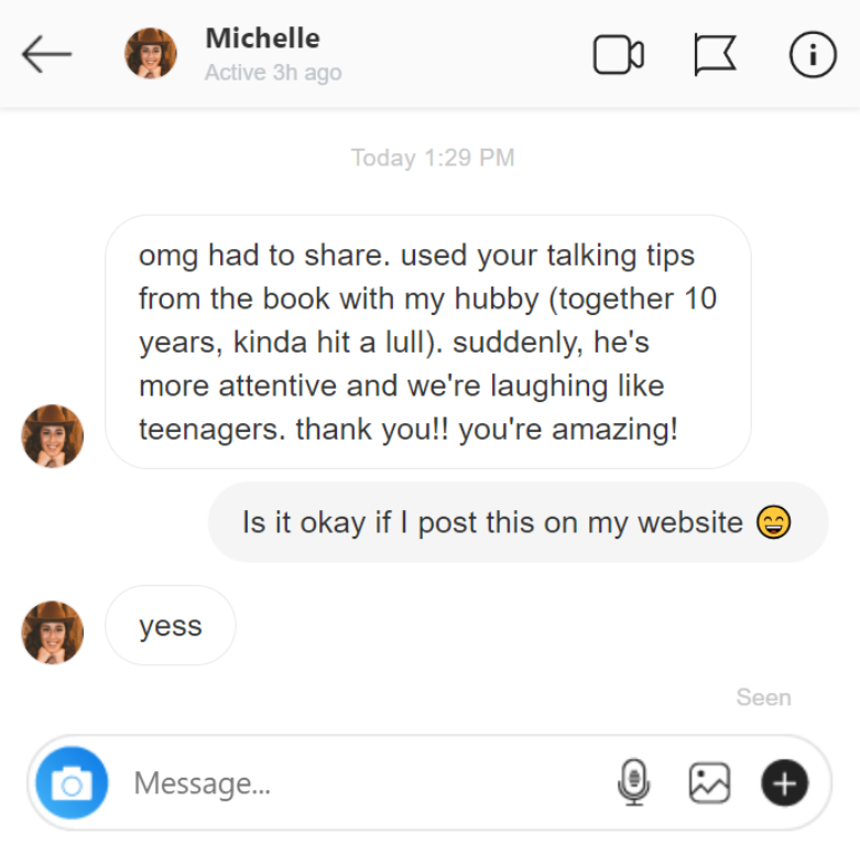“suddenly, he's more attentive and we're laughing like teenagers. thank you!! you're amazing...”